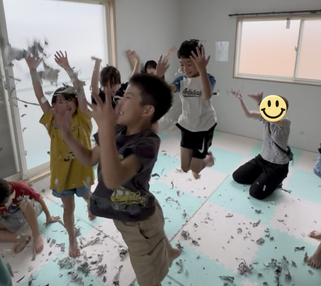 最後には、ちぎった新聞紙を