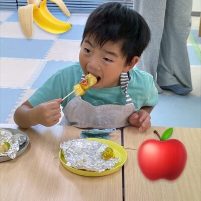 材料を切ります🍎🍌 串に刺していきます🍎🍌 お笑い担当も真剣です👀 出来上がり🍎🍌 【クッキング👩🍳】フルーツ飴🍎作り お祭りには必ずある、フルーツ飴🍎 職員…