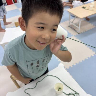 聞こえない〜👂 ぴーん!と張らないと聞こえないよ! 難しいね〜笑 【☀️夏の思い出④☀️】 糸電話で遊びましたー!!! 子どもは「大きい声を出さないで」と言われ…