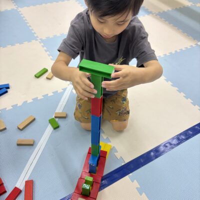 イカゲームに真剣です!笑 なかなか勝負がつかないくらい真剣です笑 自由遊びには、男の子が集まってドミノに挑戦しています