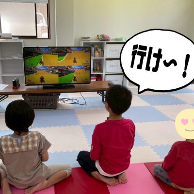 今日の活動はビジョントレーニングです! 目の動きを中心に活動します! Switchを使ったマリオカートに挑戦! ルールを守り、楽しく参加しようね!とみんなで協力…